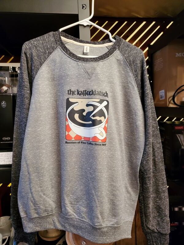 - Sweatshirt — Light Heather sweatshirt with Dark Heather Grey sleeves with color cup logo on chest — $40 (Made Locally)